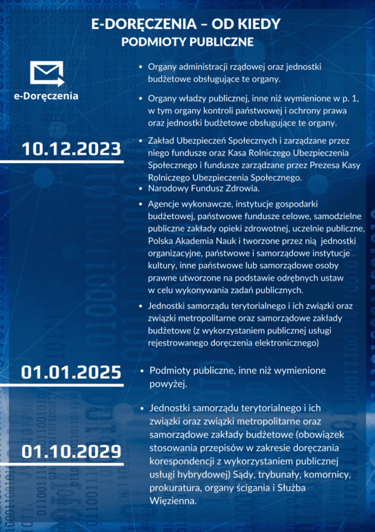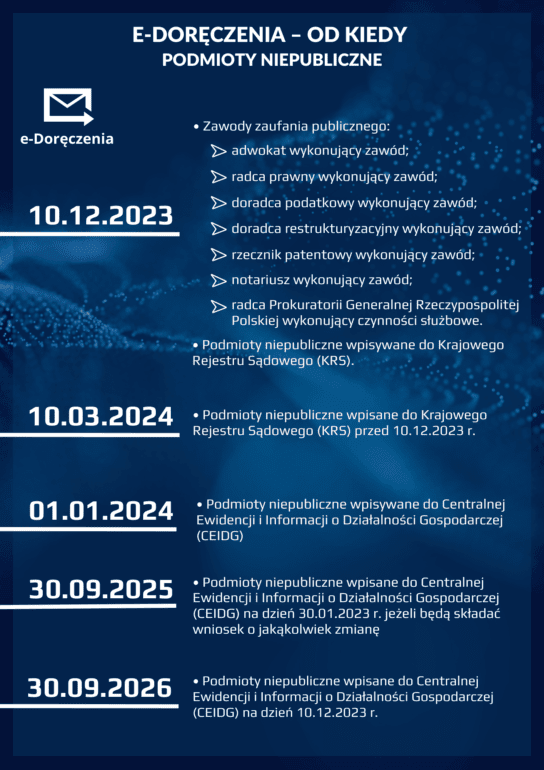 Zgodnie z obowiązującym prawem i ogłoszonym komunikatem, wymienione podmioty będą musiały korzystać z doręczeń elektronicznych zgodnie z poniższym wykazem.